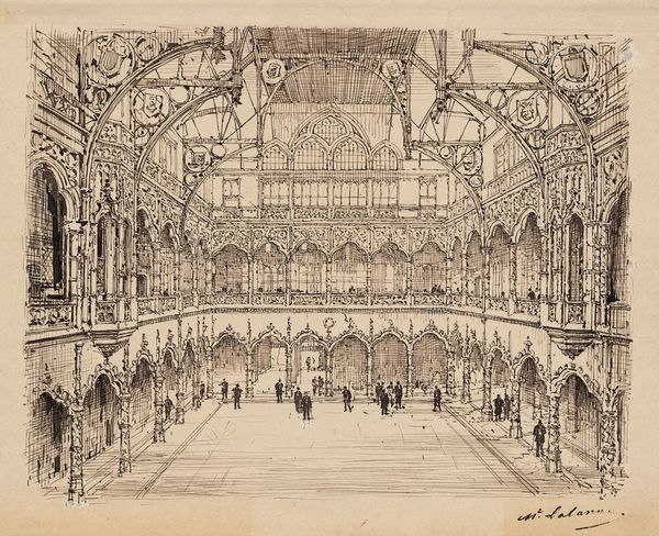 This delicate drawing by John Gregory Crace captures a gallery lined with display cases, a symbol of Victorian-era fascination with collecting and categorizing the world. Notice the arches and ornate patterns covering every surface, reflecting a desire to impose order and beauty onto the rapidly changing industrial world. The arch, a motif echoing through centuries from Roman triumphal arches to Gothic cathedrals, here frames not emperors or saints, but doorways into further chambers of collected knowledge. This act of framing connects the past and present, suggesting that even modern pursuits of science and art are built upon historical foundations. Consider how the arch has evolved: once a symbol of power and divinity, here it signifies access to enlightenment through organized display. This evolution reflects our ongoing quest to understand and control our environment, a quest driven by both intellectual curiosity and perhaps, a subconscious need to conquer the unknown. The regularity and rhythm of this design suggests an emotional need to create a sanctuary of logic.