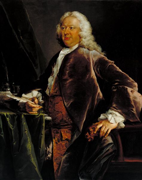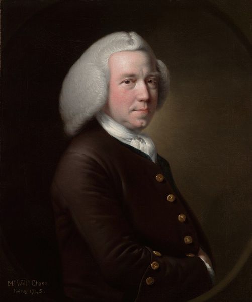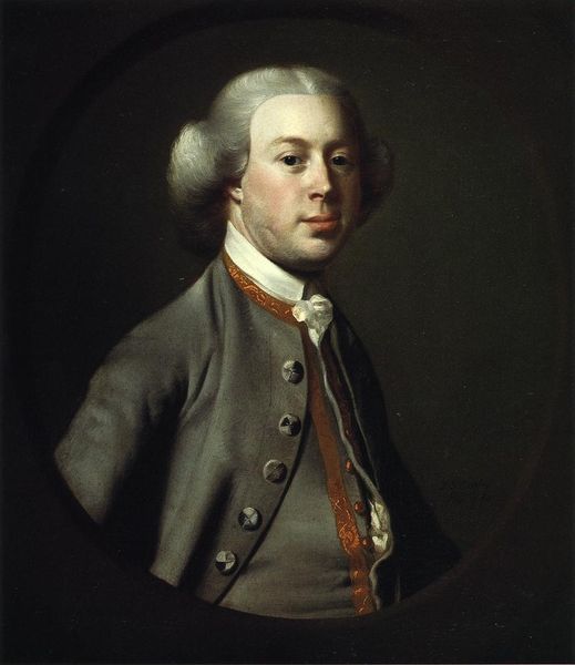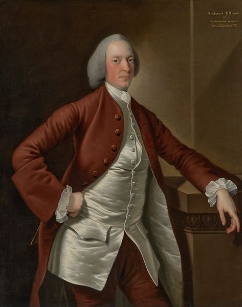 Editor: So here we have "Portrait of Edward Holden Cruttenden," rendered in oil paint by Joshua Reynolds sometime between 1720 and 1771. The sitter appears…well, quite content, maybe a touch smug? All that elaborate embroidery must have been dreadfully itchy. What stands out to you when you look at this portrait? Curator: Content is a good word! To me, it's the way Reynolds captures a kind of…contained affluence. It’s not just the clothing, it's the slight puffiness of the face, the almost languid pose. Do you notice how Reynolds’s brushstrokes are so smooth, almost invisible? It adds to the impression of effortless ease, a life free from harsh edges. I feel like he wants to project himself to others! Editor: Yes! I was focusing so much on the embroidery that I missed the subtlety in his face, and the smoothness in brushstrokes gives it an air of prestige and delicacy! It's definitely selling an image. So, it’s all about crafting this very specific message of status? Curator: Precisely. Reynolds was the master of presenting his subjects in the most favorable light, reflecting their own aspirations and societal ideals. How does the rather neutral backdrop support that? Editor: Because all of my attention gets drawn toward Cruttenden. Curator: Indeed! And did you notice the very controlled color palette of darker and paler colors, and all its elegance? It all funnels attention toward this individual and his place in the world. He wants us to look at the overall aura surrounding the portrait, Editor: It's almost like the subject is projecting this self image and expects viewers to buy in and follow what’s being laid out! This was way more intentional than I first grasped. Thank you so much for opening my eyes!