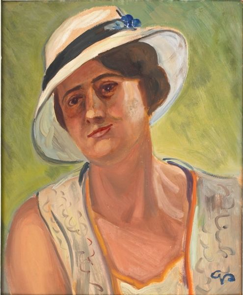 Curator: Let's turn our attention to August Macke's "Portrait of the artist's wife with a hat", painted in 1909 using oil. Considering it within its era, how does it strike you? Editor: There’s something so immediate and yet distant about her gaze. It's intimate, like a shared secret, but also…she's observing *us*, assessing, maybe a little skeptical? The colors have this soft intensity, not exactly calming, but more of a vibrant thoughtfulness. Curator: Precisely. Painted early in his career, this work encapsulates many nascent Modernist ideas percolating through Europe. Think about the societal roles of women at the time. Portraits like this start to push against traditional representations, revealing the inner lives of women, offering complex subjectivities. Editor: Her hat! It’s like a flamboyant fortress. Such confidence. Is she empowered by this fashionable accessory or is it masking her inner self, as the traditional and limited roles of women are? And the color choices... the deep indigo of her jacket set against the cool pastels—there's tension there, isn't there? Curator: I agree; it's less about mere surface representation, as had been traditional with portraiture, and more about exploring emotional and psychological states. This reminds me of contemporaneous critiques of bourgeois society that emphasize repression and hidden complexities behind polite veneers. This portrait engages with that dialectic. Editor: Dialectic! (laughs) True, and think of this: Macke could be presenting us with a glimpse into their domestic dynamic. Art historical interpretations aside, maybe this is just his wife, caught in a moment, maybe annoyed he's painting her *again*, demanding his full attention! I bet every artist who has ever portrayed a lover or family member will know what I mean. It is at that level we have a certain sisterhood in the arts. Curator: That intimate element is certainly there and can be read alongside other socio-historical narratives. So how about it—shall we proceed with our visit? Editor: It's what this "wife in a hat" wants for sure, doesn't it? Now I'm really interested in Macke's dynamic with her. She is more than a mere model in this work.