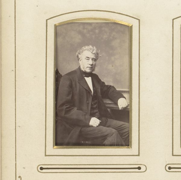 Curator: It feels almost voyeuristic, doesn't it? Looking into a life from so long ago. There's something incredibly haunting about this old photograph. Editor: Indeed. We are looking at a portrait made between 1861 and 1883, an albumen print by Maurits Verveer, currently held here at the Rijksmuseum. "Portret van een man met bril aan zijn jas," it's titled—Portrait of a Man with Spectacles on his Coat. It captures a gentleman in full formal attire. Curator: Spectacles on the coat. How wonderfully precise! The focus seems very tight, on the gentleman's gaze and composure. Editor: The formality is definitely part of it, particularly in the Victorian era. Photographic portraiture became quite popular, reflecting societal norms, wealth, and social positioning. A new way to record your own image, instead of a painting. Curator: And that serious expression. Were people of this time never smiling? He almost looks disapproving, or perhaps merely impatient with the length of exposure, which they sometimes seem so uncomfortable about, almost a slight vulnerability? Editor: The long exposure times definitely contributed to the somberness. But it was also part of the social code to present a composed, dignified image. Remember, photography was also influenced by painting traditions of the time, which also favoured that formal mode. There's something of that painted gravitas there too. Curator: Perhaps. But look how his glasses are draped there. The ordinary is trying to assert itself even across that careful composition. This little thing reveals a character. A touch of absentmindedness or informality breaking through. Or a story untold. Editor: It’s true. It's details like those, those accidental hints of the everyday, that really connect us across time, isn’t it? Seeing beyond the historical distance and seeing an individual with his quirks and habits. And thanks to this particular snapshot, the rest of us can connect, generations later. Curator: Precisely! It whispers secrets and invites our imaginings into his world, if just for a moment. Editor: Indeed, capturing not just a face, but also the faintest glimpse of a life beyond.
