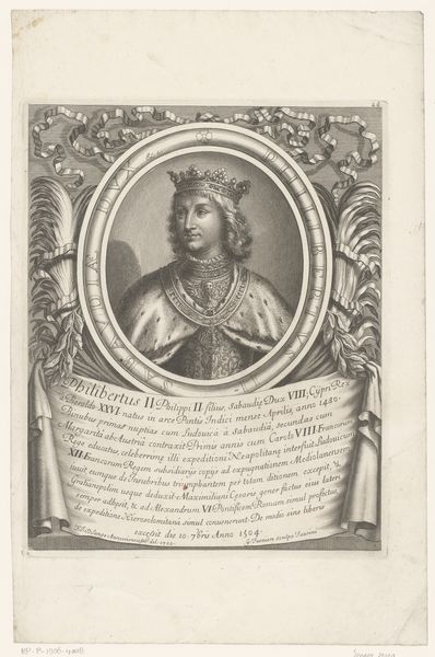 Gottlieb Leberecht Crusius created this print of Lebrecht von Anhalt-Köthen. The composition is notably structured by framing devices, offering layers of representation. Lebrecht, clad in armor, is presented within an ornate, baroque frame, set against a backdrop of what appears to be a landscape. The use of framing introduces a complex semiotic system. The frame, a signifier of the art world, encloses Lebrecht and transforms him into an object of display. This deliberate staging invites reflection on how power is visually constructed and communicated. The choice of armor speaks to historical and cultural codes. Armor suggests protection, valor, and a readiness for battle. In essence, Lebrecht isn't merely depicted; he's strategically encoded with symbols of authority and strength. Consider how this formal arrangement creates an interplay between the subject and the viewer. The print presents a carefully constructed image of power and identity, prompting ongoing interpretation.