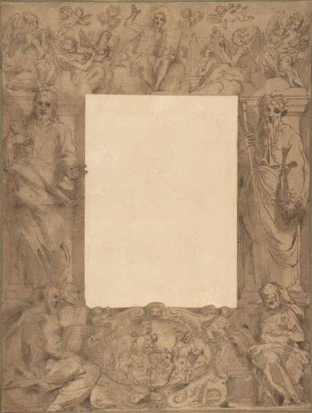 Editor: This drawing, “Design for Ornamental Border with Foliage, Putti and a Lion's Head,” is attributed to Alessandro Allori and dates to the late 16th or early 17th century. The medium appears to be ink on paper, and it features a rather ornate border with putti. The limited color palette lends the work a somber quality, despite its decorative intention. What stands out to you, and how do you interpret this work within its historical context? Curator: Thank you, that's a fine description. I see this drawing as a fascinating window into the social and political dynamics of the Renaissance. Consider how ornament functioned: It wasn’t just about beauty, was it? Who were these decorative borders meant to serve, and what narratives did they reinforce through imagery like putti and lions? How did these images perpetuate or challenge power structures, particularly in relation to religious doctrine? Editor: That’s interesting. I hadn’t considered the social implications. I suppose I saw it as simply decorative. You're suggesting the choice of foliage, the cherubic figures, and even the lion’s head was loaded with meaning? Curator: Absolutely. And whose meanings were they? Who got to decide what those symbols meant and how they would be interpreted? And how might we, as contemporary viewers, reclaim or reinterpret those symbols to reflect our own social and political realities? Does the symbolism empower, or is it just an outdated relic? Editor: So, even a design for a border has a political voice, whether intentional or not? I suppose, then, art really is never neutral. Curator: Exactly. Reflect on whose stories are framed and whose are excluded in the history of art. Editor: This perspective really changes how I view the work; I now consider whose power is enhanced by this type of decoration. Curator: Hopefully, this nuanced dialogue sheds light on decorative traditions, encouraging us to ask crucial questions about identity, representation, and the subtle politics embedded within art.