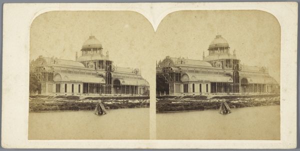 Editor: This is a photograph, "Café in the Marseille Zoo," taken sometime between 1862 and 1876 by Jean Andrieu. It's a stereoscopic card showing what seems like an ornate gazebo or open-air structure. The light and shadow play across the detailed woodwork... it almost has a miniature or dollhouse-like feel. What strikes you when you look at it? Curator: The repetition of the image creates a compelling visual rhythm, but consider also the architecture itself. These airy pavilions speak to a specific desire, born in that period, to display and classify the natural world—a desire which projected itself through these ordered structures. Look at the delicate woodwork, almost lacelike, that still speaks to a time when even leisure was constructed to enforce a kind of civilized distance from "nature". Does it feel divorced from "nature" to you? Editor: That’s a great point, I see it now. The pavilions feel so curated, so deliberately placed, it’s as if nature itself is being put on display. But isn't a zoo supposed to be *in* nature, to some degree? Curator: Exactly. The image invites us to reflect on that paradox. The “zoo” promised proximity to the exotic but offered an experience mediated and sanitized through carefully constructed settings, so the pavilions acted as an architectural filter. In a sense, the artifice mirrors our own attempts to interpret and contain the wildness of the world, even the world in ourselves. Editor: This really gets me thinking about how even something as simple as a café design can reflect larger societal ideas. I hadn't considered the implied taming of nature in the photograph before. Curator: Photographs such as this give a small snapshot, literally and figuratively, into what that era thought of "wildness". Think how many layers are present just within those symmetries!