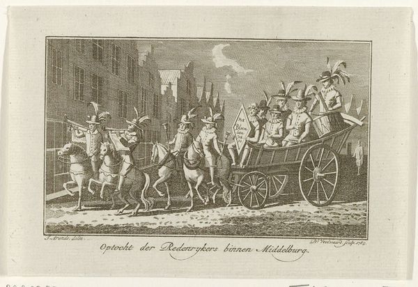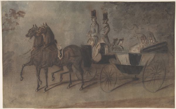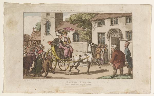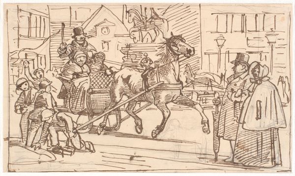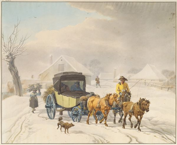 Curator: Ah, doesn't this scene just crackle with life? It's "Winter Scene in Philadelphia—The Bank of the United States in the Background" by John Lewis Krimmel, painted between 1811 and 1816. It just radiates a sort of bustling, youthful energy, don't you think? Editor: Brr, my first impression is…cold. Look at that slushy ground. You can almost feel the grit underfoot. It's watercolour, isn’t it? The Bank gives off this monumental feel which really anchors the scene. Curator: Exactly! I see a flurry of daily lives colliding, bundled up figures engaging in a playful snowball fight, and the grand architecture in the background, the United States bank is more than just background scenery—the city growing behind all this youthful innocence Editor: You know, seeing the bank loom like that makes you wonder about the conditions of labor here, who benefited and who built all this and from what materials? The grand sleigh contrasts with the presumably lower-class kids making snowballs. I bet those coats aren’t warm enough. Curator: Absolutely. There's an implicit social commentary embedded within this seemingly picturesque scene of prosperity and festivity. Krimmel shows, even at winter’s iciest point, everyone is out in pursuit of something! Editor: The materiality also interests me – Krimmel is using watercolor, which, unlike oil paints, wasn't traditionally associated with 'high' art. Was this a conscious choice to depict everyday life, a democratization of image-making, even in the choice of media? Curator: I suspect so, like the democratic-republicanism in the background. His handling of watercolor manages to make a permanent image from something generally understood as transient, almost like life. He immortalizes the moment, makes light seem to dance. Editor: Yes. I now see the luminosity, that the texture gives. So many factors that affect the production, labor and experience represented within the artwork. Thanks for that illumination, literally! Curator: Always a pleasure, seeing art isn't about facts only, it's also the possibilities an artist is making or dreaming through time! Editor: Right. We're all products and witnesses of it and its making. And if you'll excuse me, I'm off to put on another layer of thermals.