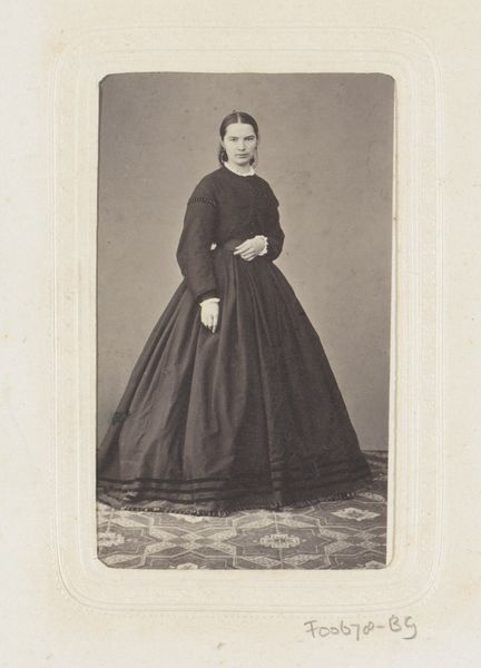 Curator: This dignified "Portret van een staande vrouw," captured between 1860 and 1870, is a gelatin-silver print attributed to the studio of Baldi & Würthle. What’s your first impression? Editor: Oh, she exudes such restrained power, doesn't she? The severe pose, that huge dress... almost a fortress. I immediately want to know her story. Curator: Exactly! Those early photographs feel like little time capsules. The very act of posing probably felt so deliberate then. You can see how she uses the garment like a social armour, maybe trying to look older or richer than she actually was. What are the semiotic signals that reveal the nature of who this lady wanted to appear to the World? Editor: Those sleeves are something, aren't they? Puffed almost to the point of cartoonishness. They scream Victorian ideal, amplified and somewhat absurd. And the carpet is a signifier of something also, but I am unsure. Something to do with the house pride and cleanliness of her? A well ordered and kept house for a lady to preside? Curator: I agree, although a bit melancholic, like the faded colours represent the passage of time, and she stands still waiting for history to unfold... Editor: That somber mood really clings to it, doesn't it? I do wonder if it also signals a hidden defiance; there's something almost rebellious in the starkness of the portrait against the flowery expectations of that era. It would have taken such work to keep still for that length of time, a conscious and sustained dedication. Curator: A powerful snapshot from a time when self-expression was still so carefully mediated. Let´s just appreciate the magic of seeing into her World, so long ago. Editor: Absolutely. A portal into her carefully crafted reality.
