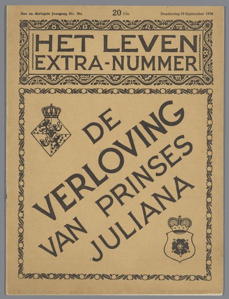 Editor: Here we have a print from 1937 titled "Historische documenten en illustraties van de verloving en het huwelijk." It's essentially a poster announcing the marriage of Princess Juliana and Prince Bernhard. I find the typography really striking. What draws your eye when you look at it? Curator: I'm immediately drawn to the interplay of typeface and texture. Notice the way the blocky, sans-serif font of the title contrasts with the more delicate, almost handwritten, quality of the names below. What does this juxtaposition communicate to you? Editor: I suppose it highlights the tension between the formality of the event and the personal nature of the relationship. But I'm not sure about the materiality – the color seems aged, almost faded. Is that intentional or circumstantial? Curator: Observe how that “aged” quality – let us call it “patina of time”– imbues the work with a sense of historical gravitas. The paper’s hue and texture, the fading of the ink – these aren’t merely imperfections; they actively contribute to the piece’s meaning. They speak to the passage of time and the enduring nature of history itself. Notice too, the columned layout of the names and titles. Editor: So you're saying the perceived decay is part of the artistic expression? Curator: Precisely. It elevates the work beyond a simple announcement to something that reflects the very nature of history and memory, which is quite appropriate for a piece commemorating a Royal Marriage. How does considering this transformation impact your interpretation? Editor: It completely changes my perspective. I initially saw it as just an old poster, but now I see the "imperfections" as intentional and adding another layer of meaning to the piece. Curator: Indeed. And by carefully examining these intrinsic visual elements, we gain a richer understanding of its complexities. Editor: Thank you! I will definitely look more into typeface, textures and color of other prints to discover meaning behind choices that I perceived previously as irrelevant.