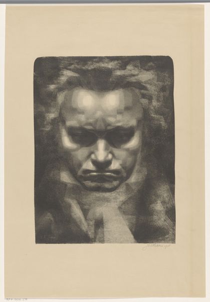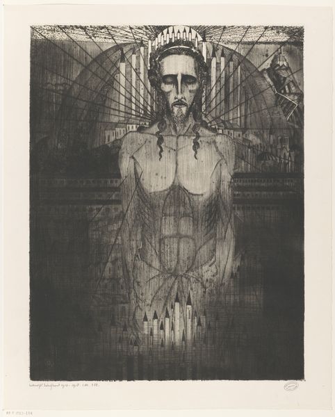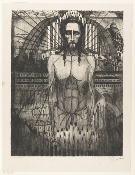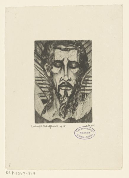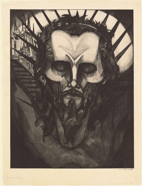 Curator: Here we have Lodewijk Schelfhout's 1913 print, "Head of Christ," currently residing here at the Rijksmuseum. The piece is rendered in monochrome, showing Christ wearing a crown of thorns with what looks to be a church in the background. What's your immediate take? Editor: Visually arresting and unsettling. The distorted, almost mask-like features of Christ evoke a strong sense of alienation and suffering. The heavy shading and sharp lines seem to amplify an inner torment. Curator: Precisely. Consider the Expressionist and Symbolist techniques here. The severe simplification of form, along with the monochromatic palette, channels a very specific emotional register. The print medium allows for sharp contrast. The lines define the face in almost geometric planes, dissecting it and thus perhaps communicating interior anguish. Editor: It's hard not to read this within the context of early 20th-century anxieties. The looming presence of the church in the background, coupled with this very raw portrayal of Christ, feels like a critique of religious institutions and their failure to address the suffering of the individual. There’s an almost confrontational tone in its refusal to romanticize religious iconography. Curator: That’s interesting because I had considered whether the church offered refuge, though the way the thorns visually penetrate both figure and background complicate that reading considerably. I had leaned toward regarding those visual planes as explorations into volume, pure geometric forms in dialogue across the surface, the Expressionist impulse pared to its bones through printmaking. Editor: And, thinking about the artist, Schelfhout was working in a time of great upheaval in Europe. Perhaps this image is as much about broader societal suffering and loss of faith as it is about any singular, religious figure’s. What resonates most is the sheer rawness of feeling; how it speaks to pain and disillusionment. Curator: I concede to your point. We often see an aesthetic idealization in depictions of Christ; this particular work violently rejects that tradition through form itself. It strips away any sense of transcendence to reveal a very human vulnerability, a very raw visual truth about the weight of pain. Editor: And, through that, it perhaps opens up spaces for solidarity, empathy, and a recognition of our shared humanity, even in moments of profound anguish. It reframes faith as something forged in the crucible of lived experience. Curator: A truly impactful and unsettling work. I will think about that context as I observe those planes of light and dark and shadow. Editor: Thank you for sharing. It really gave me something to think about in terms of representation and historical context.