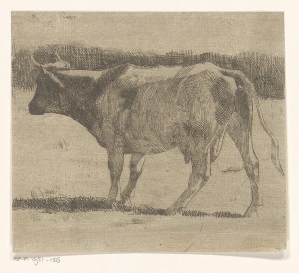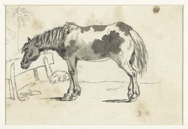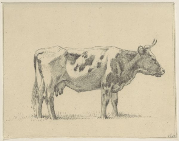 Curator: Here we have "Studie van een grazende koe" – that’s "Study of a Grazing Cow" – a drawing by Wouter Johannes van Troostwijk, likely created between 1792 and 1810. It's a work combining pencil and watercolor, currently held here at the Rijksmuseum. Editor: It's surprisingly subdued. The grey washes create a serene, almost melancholy mood. And look at the lines; they’re economical, confident, but create volume from shadows cast by a single light source. Curator: Absolutely. I find it interesting how Troostwijk is engaging with the prevailing agricultural practices and how land was being used in the late 18th and early 19th centuries. We can view this as a reflection on the evolving relationship between humans and the natural world, as animal husbandry became more systematized and commercial. The paper and pigments would have been produced through specific labor relations, connecting even this humble drawing to broader economic shifts. Editor: You’re right, context enriches it. But, strictly looking at form, see the geometry present in the shape of the cow? The slightly angular modelling of the animal—it almost hints at something more abstract. And it is a working sketch but feels complete because it renders a momentary atmospheric affect. Curator: It is a piece of art, but it is a record of someone doing some agricultural activity which becomes its context and its significance. Think of the cow not just as subject but as a product shaped by specific methods. How were these animals bred, fed? And who had access to these animals and their labor? The artwork gives rise to socio-historical exploration. Editor: Agreed, the socio-economic and production of materials is intriguing. Still, I can’t ignore the formal elegance he captured here. The stark contrast of dark and light shapes really simplifies this animal into nearly architectural forms and captures the way the light hit the animal just at that instant. Curator: Perhaps its success resides in its interplay; these materials and techniques capture the specificities of life and labour that Troostwijk himself encountered. Editor: A beautiful summation. Troostwijk transforms the mundane, in his time, through form and process, into something worthy of close observation across the centuries.