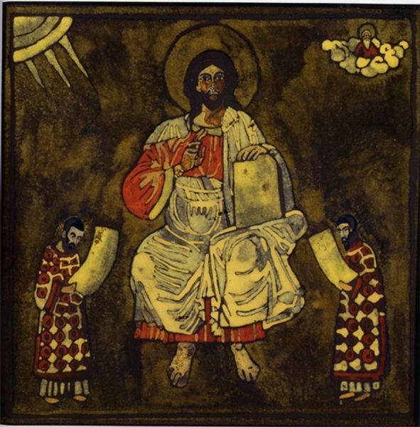 Curator: Let’s turn our attention to “Saint Nikita slaying the demon,” an 1843 tempera on wood painting, currently residing here in the Russian Museum. It depicts the triumphant Saint Nikita, haloed, and in the act of vanquishing a dark demon beneath his feet. Editor: It strikes me immediately as a rather direct visual articulation of the struggle between good and evil, but done in a style that somehow feels…grounded? Not ethereal like some other iconographic work. Curator: Indeed. The Byzantine influence is palpable, particularly in the stylized figures and the hierarchical composition, positioning heavenly figures above the earthly realm. Observe the meticulous layering of pigments, especially in Nikita's garments, a visual dance between light and shadow to imply form, while note how flat the painting seems due to the Byzantine-inspired painting style. Editor: Yes, but let’s think about those pigments, and what that means. This wasn't just conjured from thin air. It was carefully crafted; labor went into grinding those colors, preparing the wood panel, applying the gold leaf. These processes connect the artwork back to tangible resources and skilled, physical effort. Curator: Certainly, the material presence is undeniable, particularly if we read it as symbolic. Consider how the gold leaf symbolizes divine light. The tempera itself, binding pigment to egg yolk, becomes more than just a medium—it evokes age-old techniques and rituals, endowing the icon with a venerated history, beyond just its narrative subject. Editor: And consider the audience! An icon such as this served as a practical and devotional item in everyday Orthodox life. While its symbolic vocabulary operated within prescribed bounds, this function situated "Saint Nikita" inside a much wider economic framework where it became something to both contemplate and purchase, not merely a detached aesthetic object. Curator: A crucial distinction. But even appreciating it primarily on the aesthetic plane, there’s such a visually compelling quality to the contrast between the warm tones and the tenebrous form of the demon that certainly provides a good understanding of the intended message. Editor: Absolutely, but perhaps understanding more about this artwork provides the context to better decode some of the techniques and purposes behind its composition and its role within a given devotional experience. Curator: A satisfyingly thorough approach that yields to diverse perspectives on this work. Editor: Indeed. A fitting conclusion to our own small examination of "Saint Nikita."