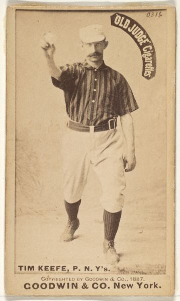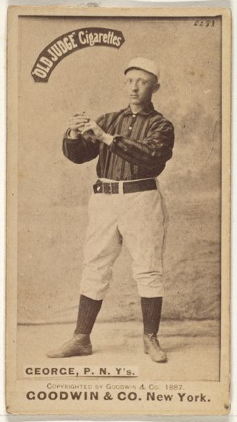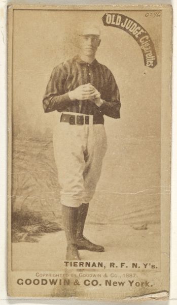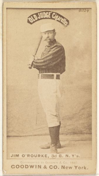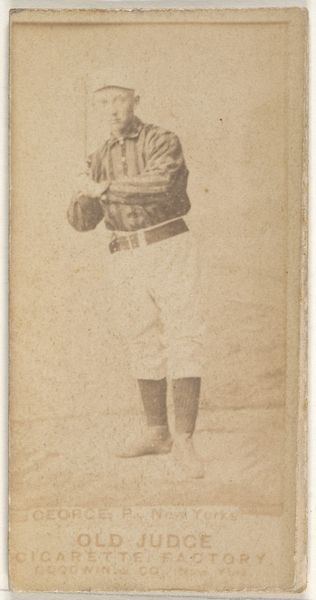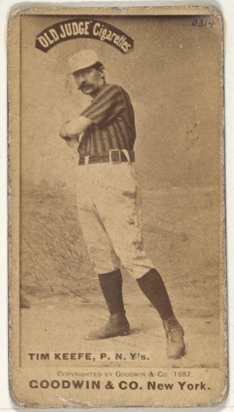 This is "Peter Patrick Gillespie, Left Field, New York," from the Old Judge series, a late 19th-century photographic print made by Goodwin & Company. The sepia tone flattens the space and gives a sense of depth. Notice how Gillespie's body is arranged—the subtle contrapposto of his stance and the slight turn of his head lend a dynamic energy. The vertical stripes of his jersey create a visual rhythm that is interrupted by the horizontal line of his belt, drawing our eyes to the center of the image. The composition, however, destabilizes the conventional portrait. The cropped edges and the tilted logo disrupt any sense of classical order, pushing the image towards a more modern sensibility. This card, originally a promotional item for cigarettes, now functions as a signifier of a bygone era. It is a relic of a time when the boundaries between commerce, sport, and art were even more porous than they are today, challenging fixed categories. What does it mean to preserve something so ephemeral? Is this an artistic or a historical artifact? The photographic print is a convergence of art, commerce, and history.