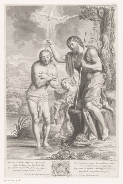 Editor: Here we have "Allegorische voorstelling: Neptunus gezegend door het geloof", an engraving made sometime between 1702 and 1762 by Jacob Folkema. The contrast between the two figures is striking. Neptune seems so…earthy, almost rough, compared to the serene figure of Faith. What's your take on this? Curator: Well, immediately, I’m drawn to the political climate in which such an allegory would resonate. The Dutch Republic, a maritime power, navigated a complex relationship with the Church. A print like this participates in constructing national identity, specifically concerning trade, power, and faith, and the imagery acts as a type of propaganda. Do you notice how Faith literally points Neptune to higher ground? Editor: That’s interesting! So you're suggesting this isn't just a straightforward religious statement, but also about the role of the Dutch Republic? How it balances worldly power, represented by Neptune and the seas, with religious virtue? Curator: Exactly! Think about the patronage system, too. Who commissioned or bought such prints? What spaces did they inhabit? Private collections, government buildings perhaps? Knowing that shifts our interpretation from simple religious devotion to the display of cultivated virtue alongside commercial prowess. Consider how visual culture functioned. Did prints like this shape public opinion or merely reflect it? Editor: So it's less about individual spirituality, and more about the relationship between political and religious institutions and how the Republic was perceived... or wanted to be perceived. That changes everything. I never thought about the political implications so directly! Curator: The artwork served as an instrument within the culture, and its function involved a deeper and richer context. Editor: I’m walking away thinking so much bigger than just the aesthetic now. Thank you. Curator: My pleasure, these reflections provide ways of broadening what art may become!