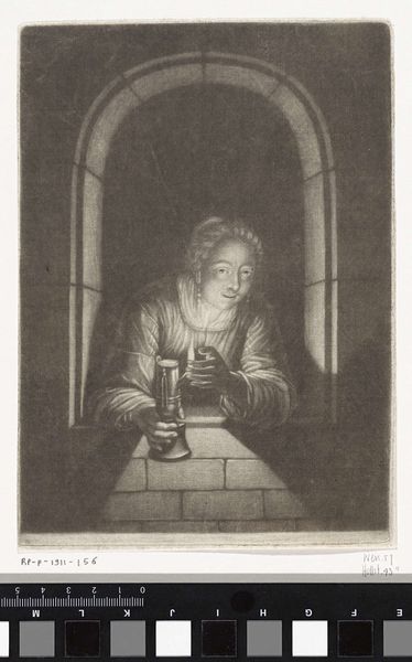 Editor: This is "Woman with an Oil Lamp" by Gerard Valck, created sometime between 1662 and 1726. It’s an etching, and the Rijksmuseum houses it. The woman seems to glow from within; the lighting is just so interesting! What compositional elements stand out to you? Curator: Indeed, observe how the light source isn't just illuminating but structuring the image. The formal element of chiaroscuro is masterfully employed, dividing the space into distinct zones. What do you observe about the shape and form created? Editor: Well, the arched window frames the woman, and the sharp contrasts between light and shadow give her figure a three-dimensional quality, especially on her face and hands. Curator: Precisely! The artist utilizes the geometric precision of the window versus the organic forms of the figure. This contrast serves as the basic organization. Valck balances horizontals and verticals to reinforce an impression of stasis. Are there other opposing elements that interest you? Editor: Hmm, I see how the dark background really pushes the light forward. The cool gray of the print, juxtaposed against the woman’s warm candle glow makes it intimate. Curator: Valid observation. The interaction highlights tonal subtleties to generate emphasis and evoke emotional engagement, guiding our eye, creating depth within the flattened dimensions. Editor: So it's all about how these shapes, lines, and tonal relationships come together to make meaning? Curator: Exactly! It invites contemplation beyond any narrative implications. It becomes an arrangement that gives insight to Valck's time period. Editor: I’ve never thought about an etching this way. I was too focused on the ‘woman,’ but now I see that its aesthetic lies in the formal organization itself. Thanks for guiding me to look closer.