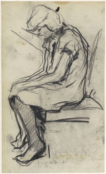Editor: This is Jean-François Millet's "Sleeping Peasant," a charcoal drawing from around 1865, currently at the Art Institute of Chicago. The sketch captures a moment of quiet rest, but it feels imbued with the weight of labor, somehow. What story do you see within this seemingly simple depiction? Curator: It's interesting that you read weariness into it. Consider the broader context: Millet and the Realists were, in effect, inventing the modern image of the peasant. Before, peasants in art were largely idealized or mocked. Millet’s images, though seemingly sympathetic, also participated in a dialogue, perhaps inadvertently, about the place of rural workers in a rapidly industrializing France. Editor: So, showing the peasant in a state of rest could be interpreted politically? Almost a statement? Curator: Potentially. Think about it: showing the peasant "at ease," or rather exhausted and vulnerable, challenged the established romanticized view of rural life. It might inadvertently raise questions about their working conditions and societal role, engaging with political ideologies emerging at the time. It pushes the viewer to consider the humanity of this figure. Who has the right to rest? Whose labour supports whom? Editor: That’s fascinating. I never considered the politics of depicting everyday rest. I guess I was just seeing it through a more personal lens, a shared human experience of needing a break. Curator: And that personal connection is valid! The genius of art lies in its multi-layered meanings. Millet gives us the surface, the image of a "Sleeping Peasant", yet it opens into socio-political realms when examined more deeply. What I find curious is how even something like a quick charcoal sketch can trigger questions about class, labor and representation. Editor: I'm definitely going to look at Realist art differently from now on! Thank you for offering such a rich, historical view. Curator: My pleasure! Hopefully, it will enrich your perception and inspire more questions, not just about the "Sleeping Peasant" but the broader narratives woven into artworks throughout history.