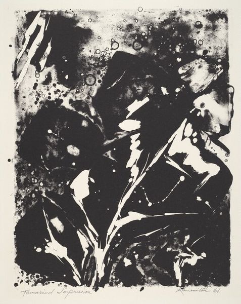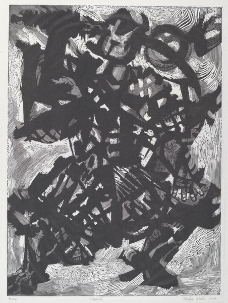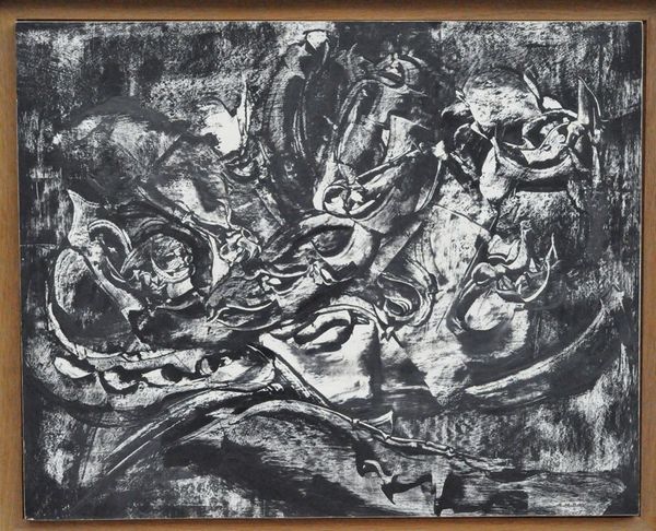 Curator: Willem de Kooning's "Landscape at Stanton Street," held here at the Tate, presents us with a frenetic, almost chaotic scene rendered in stark blacks and whites. Editor: My initial reaction is one of disorientation. It feels…turbulent? Like peering through a rain-streaked window at a city in perpetual motion. Curator: That's a very evocative way to put it. De Kooning really pushes the boundaries of representation here. The gestural marks, the drips and splatters, create a sense of immediacy, a raw energy that's very characteristic of his work. Editor: Absolutely. The absence of color heightens the emphasis on form and texture. It's a dance of light and shadow, but what exactly *is* it a landscape of? Curator: Well, "landscape" is perhaps a bit of a misnomer. It's more of an emotional landscape, a visceral response to the urban environment. De Kooning lived on Stanton Street, and this piece captures the grittiness, the constant flux of the neighborhood. He is exploring the interiority of his own feeling as a man in a place. Editor: I see. So, it's less about topographical accuracy and more about conveying a feeling, an experience. A deeply personal, almost abstract interpretation. It certainly makes me rethink what a landscape can be. Curator: Precisely. And for me, that's what makes de Kooning so compelling—his ability to transform the familiar into something utterly new and challenging.