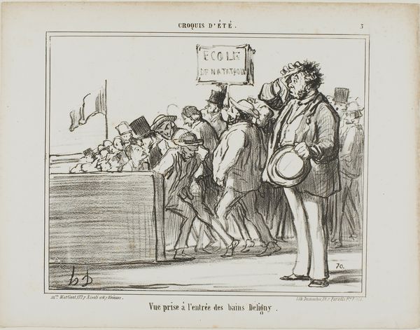 Honoré Daumier created this lithograph titled "A Visit to the Baths" as part of his "Croquis D'été" series. Notice the long queue of men waiting, clutching towels, before entering the bathing rooms. The act of communal bathing is a motif stretching back to ancient Roman thermae, places not just for hygiene, but for social interaction and public life. This image echoes the Roman tradition, yet it's transposed into a modern, urban setting. The towel, a symbol of both modesty and vulnerability, appears in countless artistic depictions of bathers throughout history. Consider the emotional tension in the faces of the men, a collective anxiety about exposure and intimacy. The human desire for cleansing and renewal is powerful, and Daumier captures how the crowd embodies our shared anxieties and desires. This scene reminds us that even in modernity, the echoes of our cultural past continue to resonate.