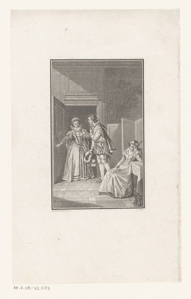 This Illustration med dame og herre foran to portrætter was created by Meno Haas, likely dating to the late 18th or early 19th century. The print depicts an interior scene dominated by the interplay between the foreground figures and the framed portraits in the background. Notice how the linear quality of the etching defines the forms and creates depth. The artist uses hatching and cross-hatching to model the figures and objects, drawing our attention to the contrast between the light, open space around the figures and the more densely worked areas that give form to the room. The composition itself functions as a kind of visual argument. The gestures of the figures—the man in consultation, the woman with her hand raised toward the portraits—suggest a dialogue about representation itself. Who are these figures in the portraits? What roles do they play in the drama unfolding below? The use of domestic space as a theater suggests broader questions about private versus public roles and how identity is constructed and displayed.