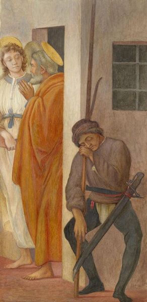 Curator: Well, look at this, will you? It feels… almost blurry, like a half-remembered dream. Editor: Indeed, this is Dante Gabriel Rossetti’s "The Passover in the Holy Family Gathering Bitter Herbs," created in 1856. Rossetti's approach here, as a member of the Pre-Raphaelites, emphasizes detailed observation, fidelity to nature, and often incorporates symbolic meanings into biblical and mythical scenes. Curator: Symbolic meanings are all well and good, but the effect it creates is like squinting in the bright sunlight, not being able to quite focus on anything sharply, but all the colours run into each other… Is that just me? Editor: No, I can appreciate your response. Rossetti frequently utilized watercolour and gouache in layers to achieve such a saturated effect, which contributes to the softening of contours. Observe, though, how he precisely articulates the postures within the tightly arranged figuration of the Holy Family, with John the Baptist and their relations all together here. Each stance and activity embodies deep-seated emotion and reflects narrative depth within this domestic interpretation. Curator: I suppose it does. Still, I prefer his paintings with more punch to them! This one is so… subdued. The way he presents a quiet scene in watercolor... It feels intensely introspective, almost claustrophobic if you consider all those people pressed into what feels like such a small space. Is that just an interpretation of the watercolor? Editor: To say the dimensions of the space feel more cramped compared to that of a classical setting highlights an interesting interpretation! Remember though, Pre-Raphaelite focus wasn't purely just naturalism. You must view that stylistic composition choice through his thematic ambition: the merging domestic and divine. Curator: That merging might feel like you're crowding the composition, as a Pre-Raphaelite approach! Editor: Perhaps this very tension enriches Rossetti’s reinterpretation of scripture, wouldn't you say? After all, that stylistic compression reinforces its message about love, loss and human hope… and it also challenges conventional pictorial narratives through his highly idiosyncratic lens. Curator: Okay, okay. I can admit that it has... something! It is as if all this compression focuses your eye on the emotional core of the family, that might only ever truly exists in dreams or memories, something ineffable, hidden somewhere between color and the story being told. Editor: Precisely.