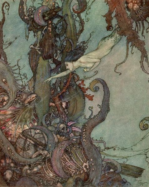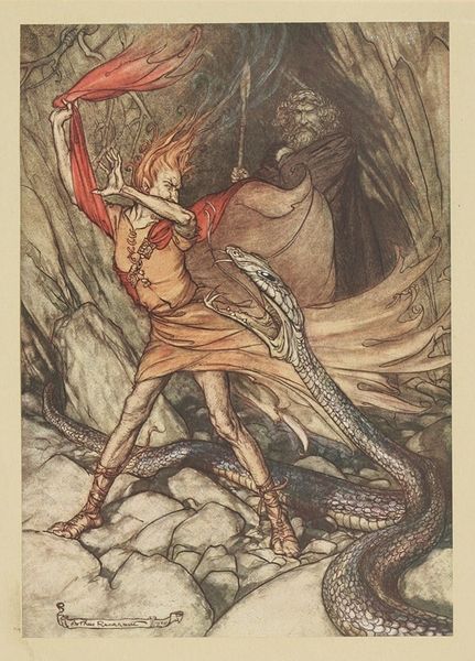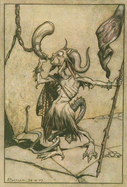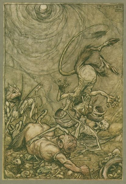 Curator: The visual storytelling here is intricate. "The Fish King and the Dog Fish," dating back to 1904, showcases Rackham's unique blending of watercolour, coloured pencil, and mixed media techniques. The level of detail, the visible layering – it's almost tactile. Art Historian: It's incredibly unsettling, isn't it? There's a palpable tension. Rackham places us in this murky, submerged world. The juxtaposition of the monstrous Fish King with the delicate figures evokes the Victorian anxieties about purity and corruption. Curator: Look closely, though. Rackham’s illustrative choices go hand in hand with how it’s made. Note the precise lines achieved through the coloured pencil, combined with soft gradations from the watercolor. It gives everything both a harshness and an ethereal quality. The labor in executing the original is so carefully managed, to such impactful effect! Art Historian: Absolutely. Rackham was operating in an era obsessed with fairy tales and folklore. He revived these stories for a mass audience. The image would’ve tapped into pre-existing narratives of innocence threatened by lurking dangers. But, was it simply for mass appeal, or perhaps a response to growing societal inequalities during industrialism? Curator: Mass appeal is certainly on display. His application of mixed-media allowed for replicable illustrations that maintained textural complexities, blurring the lines between high art and mass-produced images for printed media. He was adapting traditional artisanal skill towards larger audiences through developing new commercial applications. Art Historian: The illustration almost feels staged, in a theatrical sense, as the way that the characters relate is as if frozen in time, capturing themes present during the turn of the century about performance in high society, reflecting power and position through posing. What do you believe this positioning could be showing, and perhaps the location that is being staged within? Curator: It could well be both: he wants a level of craftmanship and replicability that allowed both beauty in detail and distribution. A truly talented material manipulator indeed. It prompts me to wonder what techniques he adapted through collaborative apprenticeship, if any at all. Art Historian: I see your point and appreciate your deep consideration of Rackham’s process. Thank you for enriching my view of this work! Curator: My pleasure! Viewing the construction illuminates how artists like Rackham catered to broadening societal reach without forgoing skill, creating a beautiful illustration like this!