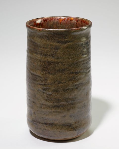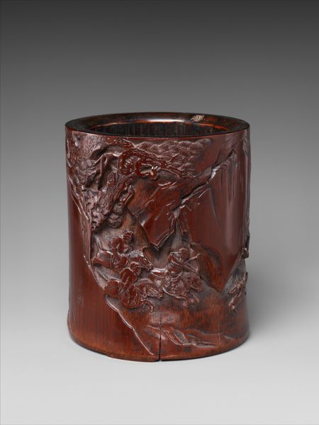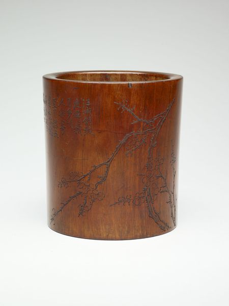 Curator: Here we have an exquisite Zitan Brushpot, created sometime between 1750 and 1850, a testament to the refined artistry of the Qing Dynasty. Editor: The depth of color is striking. The warm, dark brown of the wood creates a soothing, almost meditative atmosphere. I'm also drawn to the cylindrical form; its smooth surface is incredibly appealing to the touch. Curator: Indeed. Beyond its aesthetic qualities, this brushpot speaks to the literati culture of the time. These objects were highly prized by scholars and officials, symbolizing their status and cultivation. Notice how the bamboo is carved into the wood. Editor: Yes, and how delicate those carvings are. The artist employed what appears to be extremely precise carving techniques to bring them to life. Observe how they curve and interact, conveying dynamism. And there is also calligraphy in this work! Curator: Exactly. The calligraphy enhances the symbolism further, often featuring poems or auspicious phrases connected with intellectual pursuits and the natural world. This makes them more than utilitarian objects. The inclusion of calligraphy elevates them to the level of art. They become powerful cultural symbols. Editor: So true! By embracing a formal approach, the composition remains strikingly simple, drawing focus on the beauty of the carved artwork. This is amazing when put next to how calligraphy fills some of the surface; these contrasting approaches really play up what makes each special. Curator: Right, they exemplify how art and scholarship were interwoven. Owning such a piece demonstrated not only wealth but also good taste and adherence to Confucian ideals. Think of the cultural capital invested in objects like these. Editor: Absolutely. Examining the brushpot from a formal perspective enriches the experience. Curator: It brings a sharper sense of appreciation and also a connection with past artistic styles and sensibilities. Editor: I find myself appreciating its elegance more, knowing now how its construction connects to a cultural system.