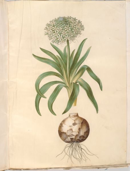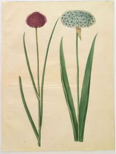 Editor: This is Hans Simon Holtzbecker’s *Allium moly (guld-løg); Allium nigrum (sort løg)*, a botanical illustration rendered between 1649 and 1659 using watercolor and gouache. It's incredibly detailed and delicate. I wonder, what do you see when you look at it? Curator: Well, first, I see the labor. Someone painstakingly applied pigment to paper, mixing watercolors and gouache to capture the textures and forms. The means of production themselves are interesting. These aren't industrial pigments, but carefully sourced materials, perhaps even hand-ground. It also sits at the nexus of art, science, and labor; illustrating plants for both aesthetic enjoyment and perhaps medicinal or scientific knowledge. How does this tension sit with you? Editor: That's fascinating. I hadn't considered the physical act of creating the paints themselves. So, you are suggesting it isn't just a pretty picture of some flowers, but rather documentation and even a product of craft? Curator: Precisely! Consider the social context of the materials. Where did the pigments come from? What was the paper made of? It is an artwork deeply embedded in the world. Think about the historical consumption of these paintings. Was it commissioned by wealthy patrons interested in expanding their knowledge of the natural world? What do we know about who commissioned Holtzbecker? The social use informs the artistic labor and execution. It complicates boundaries that separate art and scientific knowledge. Editor: I never thought about it that way. Looking closer, I notice how precise the details are—every vein, every tiny floret, meticulously rendered. I now consider how time-intensive it must have been. Curator: The intensive labor is key. It speaks to a different conception of value, doesn't it? Editor: Absolutely. It changes my understanding of not just this particular botanical illustration but of art from that era in general. Thank you for widening the scope. Curator: And thank you for engaging with a materialist reading. Considering artwork beyond traditional confines of aesthetics.