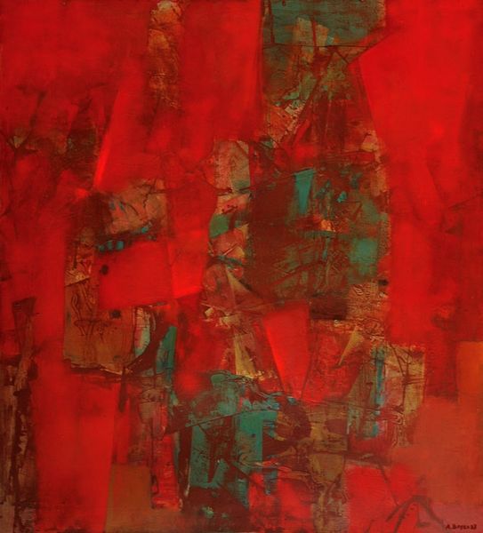 Curator: Willem de Looper's "Phoenix," crafted in 1970 using acrylic paint, presents an intriguing example of Abstract Expressionism. Editor: Immediately, I'm struck by the depth. It feels like staring into embers, that rich, almost pulsating red. It evokes a primal sense of warmth and a strange feeling of… potential. Curator: The dominance of the color red is central to its interpretation. Consider how de Looper manipulates its tonal range and saturation to create spatial ambiguity and hierarchical structure. Lighter areas recede, drawing attention to darker masses that seem to emerge. Editor: Hierarchical structure? That's a fancy way of saying it kind of glows, doesn't it? Like something smoldering under layers of ash. To me, it seems almost meditative. I could get lost in that center. Curator: Precisely. That central area, that nebulous form… it's key. It avoids concrete figuration, urging the viewer towards subjective interpretation. This piece shares traits of what’s sometimes referred to as "matter painting," where materiality and the artist's physical engagement with the medium are paramount. Editor: Matter painting. That makes me think about how physical art can be. How an artist grapples with the paint, leaves a trace. It also ties into the idea of a phoenix, born out of destruction and… well, matter. Curator: There's also the surface texture to analyze. Despite the smoothness commonly associated with acrylics, de Looper’s layering technique offers visual evidence of its own construction. It calls attention to the processes involved in creating art as an object itself, detached from the world. Editor: For sure. But art *can't* ever be fully divorced from the world, can it? I mean, even these reds and textures echo landscapes or emotional states. Think sunsets, or the flicker of anger...or love, even! It all feels very immediate and alive. Curator: It's an engaging intersection of visual strategy and spontaneous feeling that typifies Abstract Expressionism. Editor: And that's the joy of abstraction, isn’t it? It's that everyone can bring their own meaning and emotional response to what they are experiencing. It is like peering into a mirror of one’s own mind.