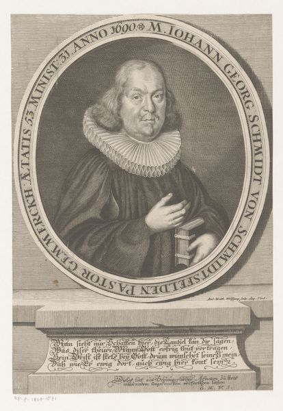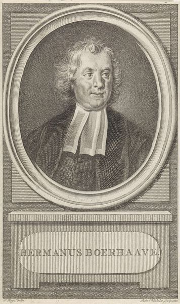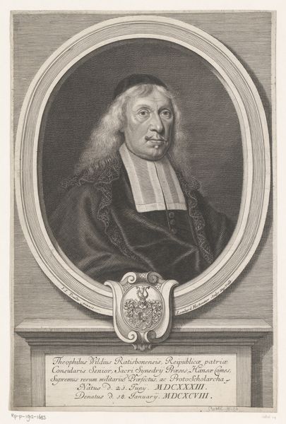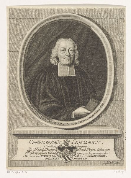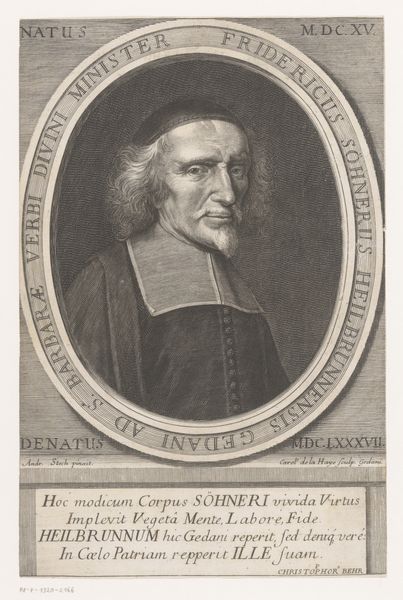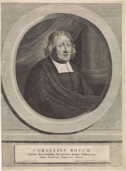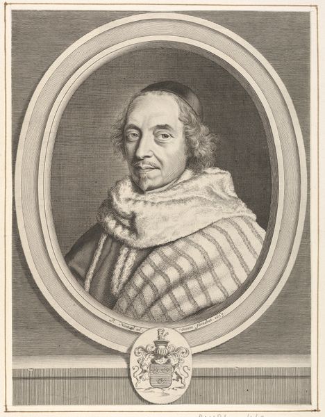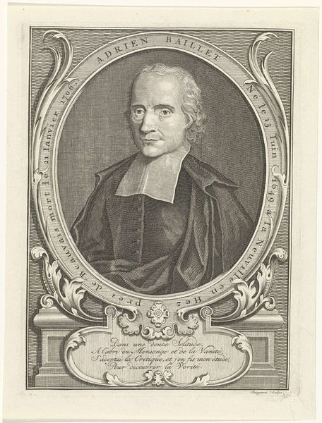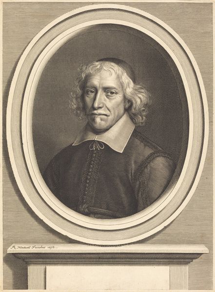 Editor: So, here we have Nicolas Habert's 1691 engraving, "Portrait of Charles Gobinet." The subject's face seems so intensely captured. The tight oval frame really emphasizes his focused gaze. What can you tell me about it? Curator: Well, considering this portrait, particularly its existence as a print, is interesting from a socio-historical perspective. These kinds of engraved portraits were often commissioned and disseminated widely. They were tools for building reputations and solidifying the standing of important figures within specific intellectual circles, religious orders, or the royal court. Editor: So, it's a little like a Baroque-era publicity shot? Curator: Exactly! And it's vital to think about who this Charles Gobinet was, not just as an individual, but as a representation of something larger. Given his garb and the inscription, “Doctor of the Sorbonne,” he was a person of religious and academic influence. How does the portrait serve that image? Editor: I guess, he looks very serious, respectable, and maybe even a bit intimidating. The sharp lines of the engraving and his unwavering expression make him seem quite formidable. Curator: And think about the act of Habert creating this print after a painting by Largillière. It shows the hierarchy and relationships of artistic production. Habert, as the engraver, plays a crucial role in making Gobinet visible and celebrated within his world. The portrait functions to ensure his legacy in that sense. What do you make of the Baroque setting? Editor: It’s much more than just an individual likeness. It's about projecting power and influence within the religious academic elite. I hadn’t considered it that way! Curator: Precisely! Looking at art through the lens of its societal function often opens up really compelling ways of understanding it. Editor: I’ll definitely look at portraits differently from now on! Thank you!