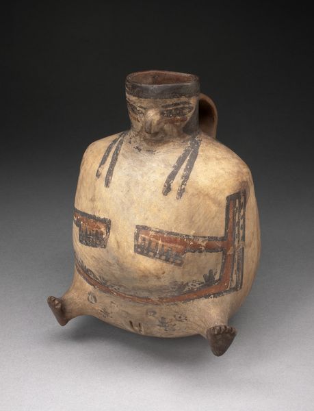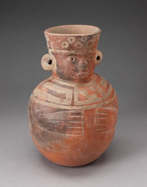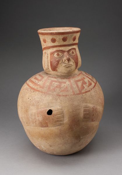 This is a ceramic beaker in the form of a seated woman, created by an artist from the Nazca culture. It is an earthenware vessel, decorated with slip paint. The Nazca people inhabited the arid coastal region of Peru from around 100 BCE to 800 CE. The figure is adorned with body paint and tattoos, communicating her identity and status, as well as the beliefs and values of her community. The face is particularly striking, with its bold lines and geometric patterns. The tattoos suggest a connection to spirituality and ritual. The creation of this beaker was a deeply personal expression, reflecting the cultural and social landscape of the time. While the beaker may have had a practical use, its artistic merit suggests a deeper symbolic meaning. It encapsulates the intimacy and complexity of a life lived over two thousand years ago. It offers a glimpse into the daily lives, belief systems, and artistic practices of the Nazca people.