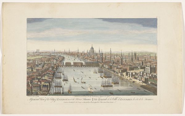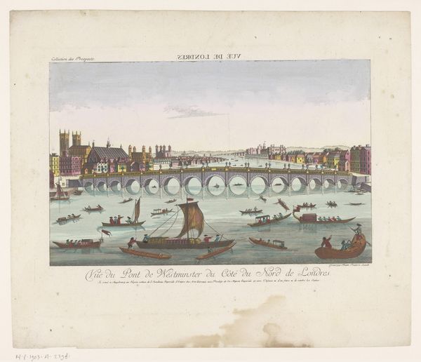 Editor: This engraving, "View of the New Bridge over the Penfeld River in Brest," by Léon Auguste Asselineau, dating from 1863-1864, depicts a bustling cityscape with impressive ships and a new bridge dominating the view. The detail is amazing! How do you interpret this work, especially considering the historical context? Curator: What I see is a deliberate assertion of modernity and industrial progress, fraught with potential for social division. The bridge itself becomes a symbol – who benefits from its construction, and whose lives are disrupted? This isn't just a pretty cityscape; it's a snapshot of 19th-century urban development, inherently tied to power, capital, and labor. Consider who is given access, represented in the foreground as passive observers of the active port workers: this scene constructs access around labor. Editor: That's interesting. I hadn’t considered it from the perspective of labor and social class. The figures do seem separate from the industry surrounding them. Does the rise of Realism, as a movement, play into that? Curator: Absolutely. Realism, in this context, can be viewed as an attempt to portray the unvarnished truth of the era. But even 'truth' is subjective. Whose reality are we seeing? Asselineau focuses on the spectacle of progress, perhaps overshadowing the impact of such changes on the working class, and also possibly occluding women from the main narratives represented. This artwork inadvertently invites a critical examination of the promises and consequences of industrialization and its effects across various groups. Editor: So, while seemingly objective, the artist's choices still reflect a particular viewpoint, or a political framing, intentionally or not. Curator: Precisely. By analyzing these choices, we can excavate the underlying narratives of the era and start crucial conversations on how we can use what art is and what it represents to impact what art can be. Editor: I never thought about it that way. Now, looking at the piece again, I see the bridge as so much more than just a bridge. Curator: And that’s precisely how art history intersects with our current understanding of power, privilege, and progress.