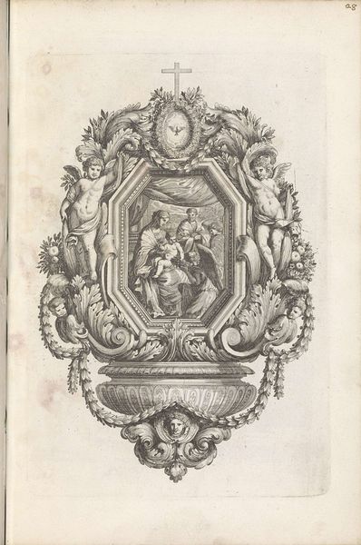 This is Jean Lepautre’s "Wijwaterbak met Tobias en de engel," an engraving of a holy water font. Notice how the composition relies on a central, circular scene framed by elaborate ornamentation. The primary image depicts Tobias and the angel, set within a landscape that invites contemplation. The surrounding framework, teeming with cherubs, garlands, and grotesque masks, serves not merely as decoration but as a structural element that enhances the scene's sacred nature. Lepautre masterfully uses line and texture to create depth and visual interest. The contrast between the detailed foreground and the softer background directs our gaze, encouraging us to explore the symbolic interplay between the earthly and the divine. This engraving exemplifies how the formal elements of art—line, composition, and texture—can combine to create a deeper narrative and spiritual resonance.