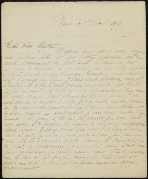 Curator: This artwork, "Brief aan Philip Zilcken," potentially dating back to 1897, intrigues me. It is a drawing in ink on paper. The lines of the lettering create a certain rhythm across the page. How would you describe the visual impact of this piece? Editor: Well, the calligraphy definitely strikes me first. It’s not the most legible script, but the shapes and forms the letters make create a beautiful, almost abstract, design. What else do you see in this work beyond its purely functional aspect as a letter? Curator: Function is interesting. While the letter serves to communicate, its artistic merit lies in the intentionality of its construction. Note how the placement of text is balanced with a careful deployment of the negative space; even the slightly imperfect grid provides an underlying order. Would you agree? Editor: Yes, definitely. The neat lines give some control. Even though it is handwritten, and of its time, that attention to form gives it a structured feel that is beyond just scribbling a note. Are the textural qualities of the paper also important, do you think? Curator: Undeniably. The paper’s texture interacts with the ink, influencing the line's quality and density. Furthermore, the ageing of the paper introduces tonal variations, contributing to the visual depth. Editor: I see, it's not just about what's written, but *how* it’s presented, that elevates it to art. Curator: Precisely! The material and construction, through the artist's choices, produce a stimulating viewing experience, exceeding the letter's intrinsic function. The convergence of form and intentional design is what I find most profound about this piece. Editor: This formal breakdown really highlighted details I wouldn't have thought about on my own! Thank you.