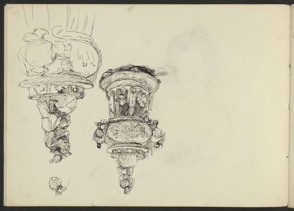 Curator: The first impression is one of lightness, almost fragility. It feels like catching a fleeting thought before it fully forms. Editor: We’re looking at “Ontwerp voor onderdelen van kandelabers en vazen,” or “Design for parts of candlesticks and vases,” a pencil drawing by Henri Cameré, dating from around 1864 to 1894. These are sketches, initial ideas captured on paper. And thinking about that moment of creation is interesting given Cameré’s status as an industrial artist working in the second half of the nineteenth century in the Netherlands. Curator: Yes, the act of design itself becomes visible. I’m particularly struck by the repetition of forms – the scrolls, the acanthus leaves – recurring across the sheet, hinting at the visual vocabulary that was prevalent in designs of that period. A lexicon of grandeur, one might argue, aimed at expressing and embodying social status. Editor: Absolutely. Those motifs speak of power, echoing classical and baroque aesthetics, but applied in an industrial context. The symbolism here is compelling. Think of the candle as a signifier of light, knowledge, even domestic comfort, presented within these elaborate, almost performative structures. It speaks volumes about the aspirations of the era and what these domestic objects represented. The designs feature vases as well as candlesticks so also consider how integral flower arrangements were to nineteenth-century rituals of presentation, which made vases potent symbolic vessels in middle class society. Curator: And the contrast with the medium itself – a humble pencil sketch – is striking. It's a democratic medium depicting emblems of privilege. How do you read that tension? I think it speaks to the broader social and economic shifts happening in that period. While design is embracing accessibility, class distinction persists. Editor: That’s perceptive. The sketch also highlights the evolution of design itself. We are peering into a workshop moment, where utility meets artistry. Curator: Exactly! The drawing offers a window into a pivotal moment. These aren't just designs; they are documents of a negotiation between societal values and artistic expression, mediated by the evolving industrial landscape. Editor: Ultimately, Cameré provides the opportunity to trace how aesthetics helped to shape our experience, not just in the 19th Century but for years afterwards.