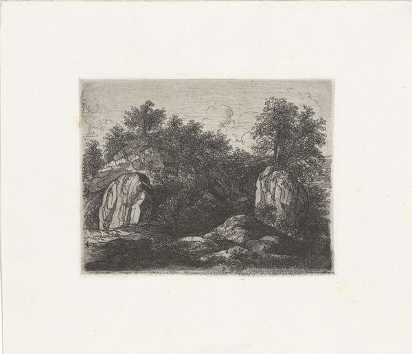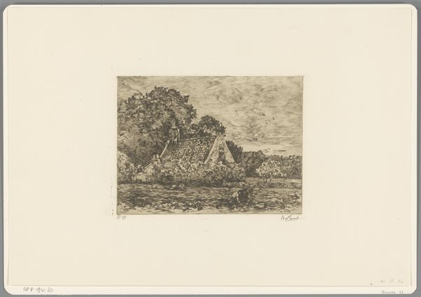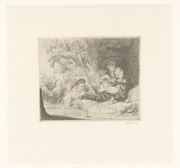 Rodolphe Bresdin created this small etching, *La Sainte Famille*, using a complex network of lines, sometime in the mid-19th century. The dense, almost claustrophobic, composition invites us into a scene teeming with life. Bresdin masterfully employs hatching and cross-hatching to model forms and create a sense of depth. The figures of the Holy Family are nestled within a thicket of vegetation, their forms emerging from the intricate web of lines. Note how the artist uses the density of lines to create areas of shadow, contrasting with the lighter, more open spaces to suggest form and texture. This technique, reminiscent of earlier masters like Dürer, is pushed to the extreme, creating a hallucinatory effect. The landscape, though small, is rendered with an astonishing level of detail, blurring the line between reality and dream. Bresdin invites us to consider the boundaries between the sacred and the mundane, the real and the imagined, within the formal structure of his meticulously crafted composition.