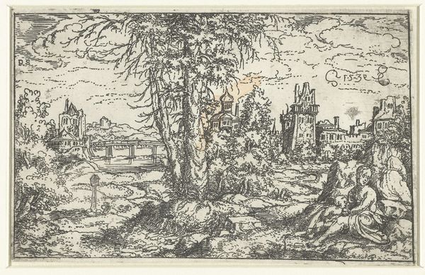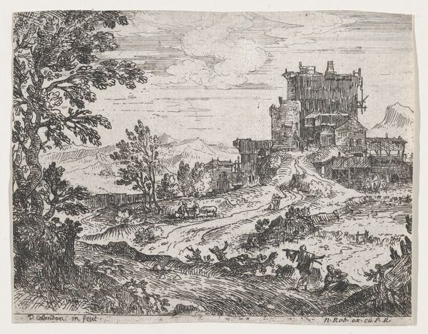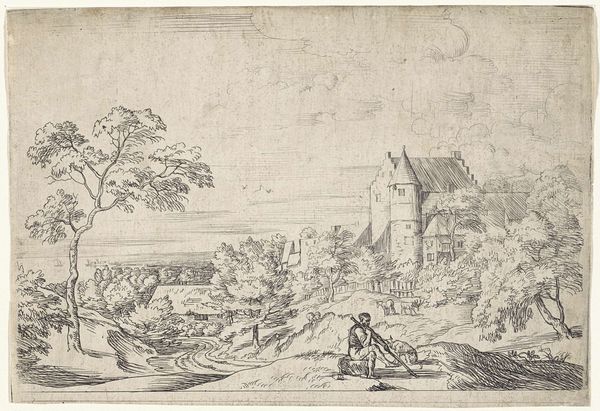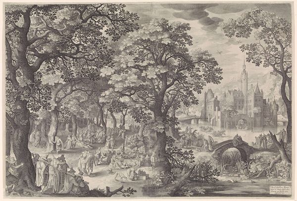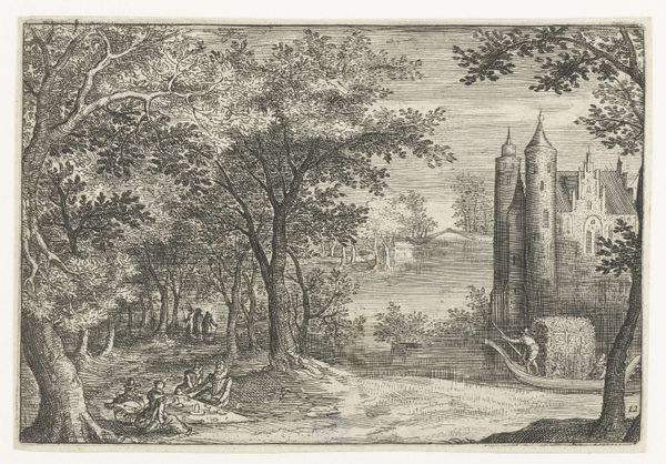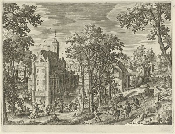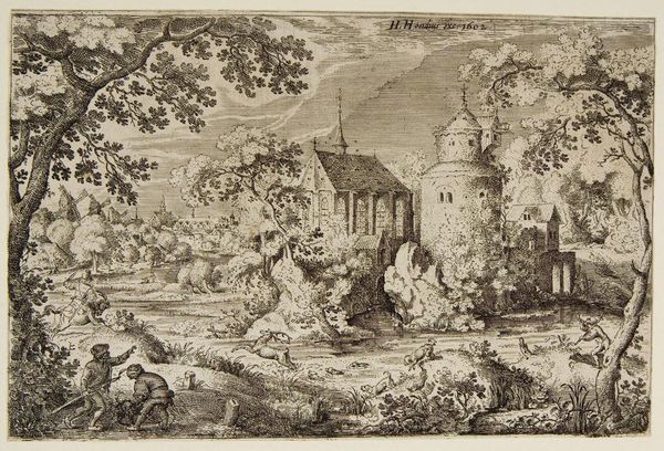 Editor: This is "Deer Hunt near a Chapel" by Jacob Savery I, an etching from 1602. It feels so meticulously detailed, almost like peering into a miniature world. The chapel juxtaposed with the hunt… how do you interpret this image? Curator: The scene, at first glance, seems like a simple depiction of daily life. However, consider the placement of the chapel—a beacon of spiritual solace—overshadowed, almost besieged, by the chaotic energy of the hunt. Doesn't that strike you as a symbolic tension? Editor: I hadn't considered that tension so directly. I was caught up in the busy details. Curator: Indeed. The hunt, a primal activity tied to survival and dominion, takes place in the very shadow of a religious building, meant to inspire self-control. It's a dichotomy often seen in art of this period. Ask yourself what persistent symbolic value is present by placing the sacred and profane so closely together? Editor: So the image isn’t just showing us a hunt, it’s presenting ideas *about* human nature and morality? The deer as symbolic of something else entirely, innocence perhaps? Curator: Precisely. Notice how the deer flee toward the chapel, seeking sanctuary. Consider this, where else might people go to seek safety, refuge and perhaps even redemption? How are we to reconcile the sacred and the visceral? Editor: That makes me see the whole piece differently. Thank you. Curator: The layers of meaning are what make it so compelling, aren’t they? Images are seldom just themselves, they invite a much deeper conversation about who we were and still are today.