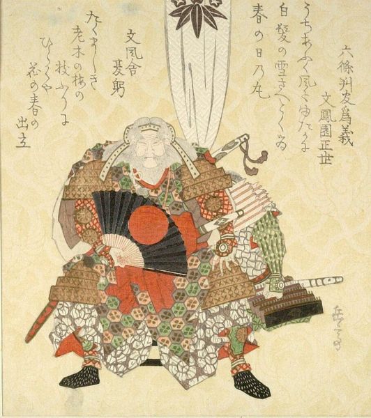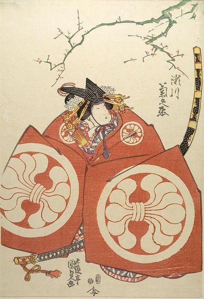 Curator: Gakutei's print, “Tamura Shogun,” from the series Twenty-Four Generals for the Katsushika Circle, presents us with a legendary figure. The dimensions of the paper are roughly 20 by 18 centimeters. Editor: The patterned armor creates an almost abstract field, disrupted by the diagonals of the bow. Curator: It's interesting to consider the context of this series; these generals were popular figures whose images reinforced the socio-political order. Editor: Note how Gakutei uses varied textures to distinguish the materials—the smooth face, the rough armor, and the fur of the mythical beast. Curator: Indeed, and the inclusion of calligraphy further enriches the print's narrative and cultural value. Editor: Ultimately, the arrangement creates a powerful, if stylized, vision of leadership.