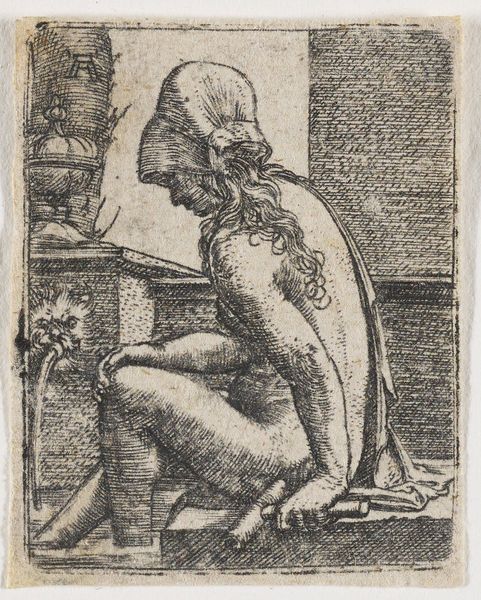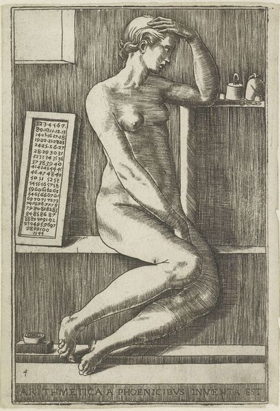 Editor: This is Elihu Vedder’s "The Cup of Love," created around 1883-1884 using ink, pencil, and colored pencil on drawing paper. The nude figure and accompanying poem give the work a very intimate, almost forbidden feel. How do you interpret this work? Curator: It’s a striking piece. Vedder's drawing really asks us to consider the relationship between art, the body, and societal expectations. The nude figure, presented in this very academic style, engages with themes of both eroticism and vulnerability. How do you think the poem contributes to our understanding of the image and those themes? Editor: It speaks of fleeting moments and the cyclical nature of experience… almost like an acceptance of pleasure and mortality. But I'm not sure how the female figure really connects to that. Curator: Perhaps consider it through the lens of the Symbolist movement. Vedder uses the female figure to represent abstract concepts of beauty, desire, and even the human condition itself. How does that sit within a society that historically policed women's bodies? Editor: I see, so the artwork is making a larger statement about society through this image and poem. Curator: Precisely! It uses the female form to explore profound philosophical questions about existence and fleeting moments, challenging the viewer to confront societal norms and contemplate the complexities of human experience. It urges us to analyze the artist's underlying intentions as we grapple with our personal connection with pleasure. Editor: That’s a powerful perspective. I initially saw it as a straightforward erotic artwork, but now I realize there's a deeper exploration of the self. Thanks for that new way to appreciate the art. Curator: And thanks to you, too, for bringing your own perspective to the artwork. That's how dialogues are formed.