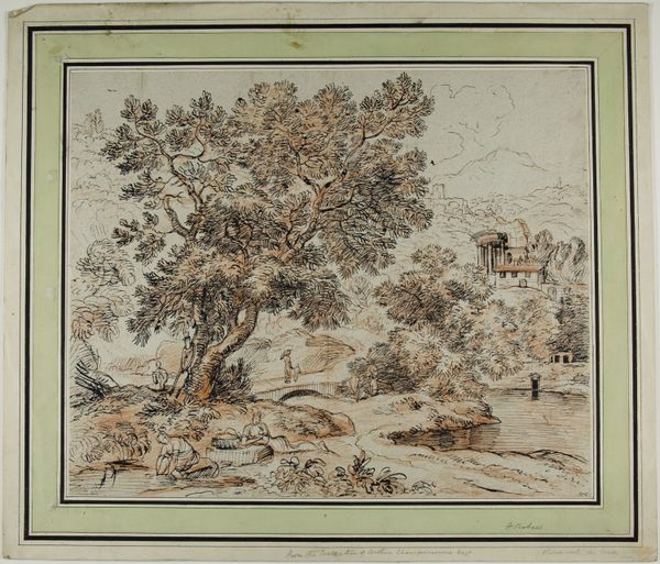 Franz Kobell rendered "Warrior and Dog Resting by Rocky Rapids," using pen and brown ink, with grey wash, on paper. Observe how Kobell uses tight, parallel lines to build up form and texture, creating a sense of depth and volume. The dark, dense hatching defines the contours of the rocks and foliage, contrasting with the lighter, sparsely treated areas that suggest open space and sky. The composition guides our eye from the foreground figures—the warrior and his dog—towards the cascading water and rocky landscape, culminating in the distant hills. This arrangement creates a stage-like setting, where nature is not just a backdrop but an active participant in the narrative. The cross-hatching and tonal variations suggest an interplay between light and shadow, highlighting the ruggedness of the natural world and the serene moment of rest. Consider how this deliberate technique invites us to reflect on nature's power and the transient presence of human activity.