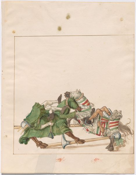 Curator: Immediately, I'm struck by the chaotic energy in this rather small-scale watercolor illustration. Editor: Indeed! This intriguing drawing, entitled "German Joust of Peace," dates from around 1512 to 1515. While its creator remains anonymous, its depiction of a jousting match provides valuable insights into the era's social rituals and the performative aspects of power. Curator: A "Joust of Peace," you say? Given the tangled mess of horses, lances, and fallen knights, it feels anything but peaceful! There’s almost a comic quality to the scene, defying the presumed formality of such an event. Editor: Well, that's the irony, isn't it? Jousts were heavily codified events, and even when intended to be “of peace,” the potential for real harm was ever-present. This image captures that tension between spectacle and potential violence inherent in these events. The watercolor medium itself seems to emphasize the fragile, almost fleeting nature of chivalry, doesn't it? Curator: Precisely! And look at the horses—they’re as much characters in this drama as the knights themselves. There is an abundance of symbolism here, if you look closer. I'm seeing that their decorative cloths suggest particular lineage. One seems to be green, alluding to new growth, springtime, rebirth. The cream or tan coloring is about peace, but as you said, what lies beneath the surface. Editor: You’re right, their appearance carries symbolic weight. One wonders about the social dynamics at play: Was this joust meant to solidify an alliance? Was it about prestige and display of wealth? These competitions served a public function; they visually reinforced existing social hierarchies. Curator: I imagine a bustling audience, too—an aristocracy keen to witness and be reminded of their own status, contrasted to those unarmored and on foot! The fallen knight serves as a potent symbol of risk and consequence but also the ever-present potential for social mobility. Editor: Absolutely. This image really encapsulates the precarious position that nobility can occupy. Despite its imperfections, this watercolor and ink work on paper is rich with cultural and historical resonance. Curator: I agree, examining this image today brings into view a range of medieval social complexities and customs. Editor: And even though it is "anonymous" it opens so many areas to discover more.