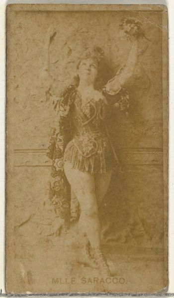 Editor: Here we have "Miss Deering, from the Actors and Actresses series," a print created sometime between 1890 and 1895 by W. Duke, Sons & Co. as a cigarette card. The sepia tones and the somewhat ethereal pose give it a dreamlike quality, almost like a memory. What do you make of it? Curator: Ah, a fleeting glimpse into a bygone era, isn't it? Immediately, I’m struck by the confluence of art forms—photography masquerading as a drawing, hinting at Japonisme with its flattened perspective. I wonder, was this simply advertising, or something more? Think of it—Miss Deering, an actress, becoming an object of desire through consumer culture. Did this little card, tucked into a pack of cigarettes, hold a subversive power? Did it allow folks to dream beyond their reality? Editor: That's fascinating. I hadn’t considered the social impact of a cigarette card. I guess I was more focused on the artistic influences. Curator: And that’s valid too! It mirrors the Ukiyo-e prints with its subject and ephemeral nature; the everyday elevated. These cigarette cards offered little windows to faraway lands, both real and imagined. Is that a set of fairy wings I see? Editor: They do appear to be! It feels a bit contradictory to have that ethereal touch linked to something as mundane as cigarettes. Curator: But that contrast *is* the magic, isn't it? The blurring of boundaries, the collision of high art and low culture, of aspiration and consumption. Makes you think about what we consume and what consumes us in return! It's the sort of collision that reveals what the dreams of people actually are! Editor: You've definitely given me a new way to appreciate something that seemed pretty simple at first glance. Thanks! Curator: My pleasure! Art’s like a cosmic joke, always winking, always demanding we look twice…or perhaps take a puff, metaphorically speaking, of course.