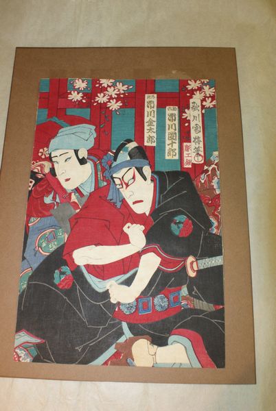 This is the left sheet of a kabuki triptych by Utagawa Kuniume, made in Japan in the late 19th century. The print employs bold color contrasts and dynamic patterns to draw the viewer into a dramatic moment. Note the stark division of the background into a dark blue field scattered with white cherry blossoms on the left, and a red field on the right. These create a visual tension that reflects the theatrical nature of kabuki. The figures, rendered with precise lines and flat planes of color, are adorned in intricately patterned kimonos. This juxtaposition of patterns and colors creates a visually stimulating surface, typical of Utagawa's style. The composition is structured to emphasize movement and emotion, heightened by the stylized gestures and facial expressions of the actors. Utagawa’s interest is less in spatial depth than in capturing a fleeting moment of heightened drama. This print serves as a fascinating study of the surface, where the interplay of color and pattern creates a world of its own.