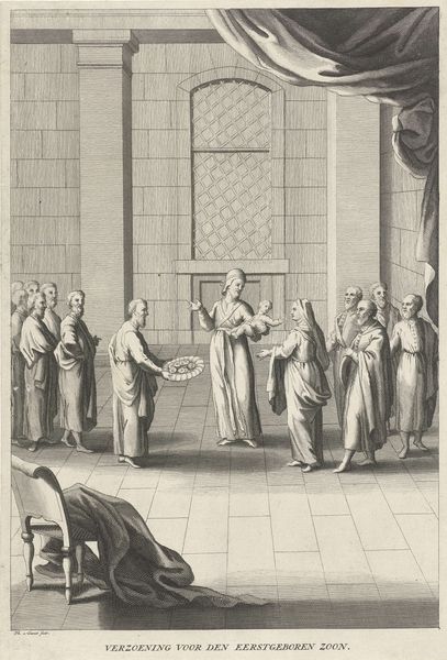 Curator: Look at this intriguing scene— "The Wedding at Cana," an engraving from around 1670-1672, currently housed at the Rijksmuseum. Editor: My first thought? Chaos. The image is so busy, filled with figures. The contrast feels harsh. Curator: As a historical artwork, it depicts the biblical story of Jesus' first miracle: turning water into wine during a wedding feast. You can almost feel the bustling energy of the wedding. I mean, the scene depicts an exclusive inner chamber while the broader setting alludes to communal practices associated with early notions of governance and law making. Editor: Do you really sense “communal practices" when everything is dominated by Jesus? Even within the setting there's a clear visual hierarchy that's reflective of social strata; with gender dynamics so unbalanced here... how much room is there to interpret genuine community? Curator: That's a fair critique. Baroque art, generally speaking, was very keen on clear symbolic cues like that; hierarchies were intrinsic in religious art that time. Editor: I agree, but I think our awareness of power imbalances compels us to analyze not just what the artwork "shows," but what its ideological underpinnings mean for a modern audience— and its place within evolving dialogues around equality and liberation. We still need to interrogate whose perspective this story privileges and what it marginalizes. Curator: Absolutely, analyzing those biases helps. Focusing on what an artwork meant in its original social context helps avoid overly presentist views of art, doesn’t it? For instance, many things we may now identify as marginalising were deemed essential virtues at that point. Editor: To be clear though, focusing on contemporary interpretations is not about being overly presentist, but being more responsible to what it could signal. How can a modern museum present art that invites reflection? That acknowledges our changing understandings? I look at all the water jars lined up and want to scream: whose labour made the water that got turned into wine, for whom and on whose dime? Curator: Point well taken; and what about all the feast leftovers discarded at the floor? This piece is just dense in symbolic social, religious and ideological meanings. It’s wonderful to delve deeper in its complexities together. Editor: I agree. It's a work that rewards those efforts. Hopefully visitors will keep questioning beyond our talk today.