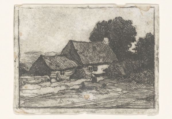 Curator: This is "Heuvelachtig landschap met boerenhofstede," or "Hilly landscape with a farmstead," an etching made by Louise Danse in 1887. It's part of the Rijksmuseum collection. Editor: There's a melancholic feel to it, don't you think? The textures feel aged, worn by time and weather. Note how the artist employs only etching; there are not color variations, so it highlights pure form and composition. Curator: I agree about the melancholic quality. Rural scenes like this gained popularity as cities industrialized. Images idealized simpler ways of life as antidotes to rapid societal change and, moreover, the economic forces displacing them. Danse, as a female artist, occupied a space distinct from her male contemporaries portraying landscapes, usually reflecting bourgeoise values. Editor: The lines really define everything, a meticulous process of the artist who, even so, renders all the imperfections and ruggedness of buildings. Do you find her vision aligned to photographic realism? Or, is this romanticization evident even in what appears, at first sight, like an objective reproduction? Curator: Both, perhaps? While Danse meticulously observes architectural detail, her artistic choices seem very much informed by broader artistic trends, the Barbizon school especially. These choices would have reflected her audience: one educated enough to read nuances while yearning nostalgically for disappearing landscapes in Belgium. I think we’re able to examine not only representation, but artistic identity itself through it. Editor: True. The cross-hatching builds density that lends form to shapes and space while reinforcing its rustic character. How can we better translate how class structures influence landscape representations and the viewer engagement at the time? Curator: The etching itself is significant here; it was a medium accessible to wider audiences, democratizing access to art unlike, say, oil paintings commissioned for wealthy patrons only. Danse exhibited extensively; therefore, her work became actively part of visual culture. This makes each choice even more significant in shaping and reflecting collective aspirations during this period of transition. Editor: I concur; viewing this not only as a representation but a participant in social discourse indeed deepens the meaning of form and structure in itself. We cannot examine formal elements outside a critical understanding of their participation in the political and economic discourses of its time.