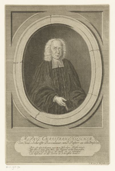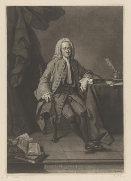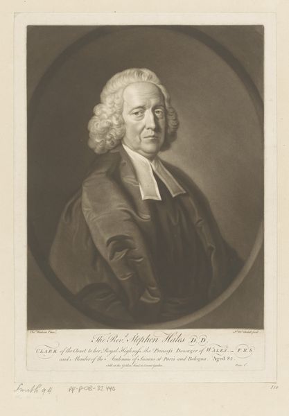 This is James McArdell's 1754 mezzotint portrait of John Nicoll, now held in the Rijksmuseum collection. The image operates within the well-established visual codes of eighteenth-century portraiture. Nicoll, a Doctor of Divinity and Prebendary of Westminster, is depicted with the trappings of his office: clerical robes, a neatly styled wig, and a book, likely of religious significance. The print was produced in England, a time of significant social stratification and religious conservatism. The Church of England held considerable power, and portraits like this one served to reinforce the status and authority of its members. Nicoll's confident gaze and dignified posture speak to his position within this hierarchy, reflecting a society where religious and academic credentials conveyed considerable social capital. Understanding this image requires more than just aesthetic appreciation. We can delve into the history of the Church of England, explore the social role of the clergy, and examine the conventions of portraiture in Georgian England. This kind of research allows us to understand art as a product of, and a commentary on, its time.