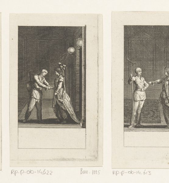 Daniel Nikolaus Chodowiecki created this print, Vier scènes uit Gellert's Fabeln und Erzählungen, in the late 18th century. In these four scenes, observe how gestures and settings evoke societal expectations and human interactions. Take for instance, the theatrical stage in the first panel, reminiscent of ancient Greek dramas. The stage is set for moral lessons, revealing the performative nature of social life. Consider the motif of 'the gaze,' central to understanding societal dynamics depicted here. Notice how characters observe each other, mirroring the constant surveillance and judgment inherent in social structures. It reminds us of the Panopticon, a symbol of control where the watched internalize the watcher's gaze. These images, like cultural echoes, remind us of the psychological weight of social norms. The cyclical nature of these scenes urges us to recognize how human behavior and its observation, perpetuate themselves through time, constantly reemerging in new forms.