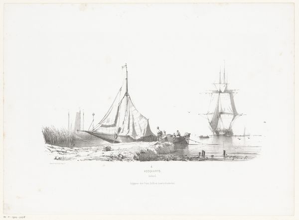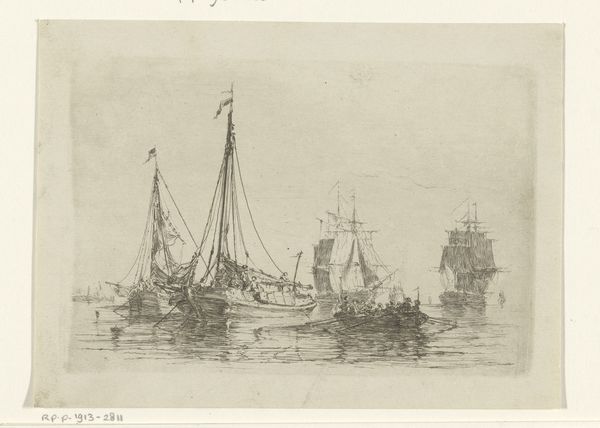 Editor: This is Johan Conrad Greive’s “Tjalk,” made around 1860, using etching and ink. It's a lovely little drawing; the stillness of the water and the way the ship is rendered make it feel almost dreamlike. What draws your eye to this print? Curator: The stillness you mention is key. It speaks to the symbolic power of water in Dutch art – often representing not just livelihood, but also the subconscious, the depths of cultural memory. Notice how the tjalk, a traditional Dutch sailing vessel, sits almost heavy in the water, its image deeply ingrained in the national psyche. Editor: So the tjalk isn't just a boat? It's more of a symbol? Curator: Precisely. Think of the maritime paintings of the Golden Age; ships represent prosperity, exploration, but also vulnerability against the vastness of nature. Greive, even in this smaller, later work, taps into that deep well of symbolism. The ship becomes a vessel for collective experience. Consider too, how the etching technique itself, with its delicate lines, mirrors the fragility of human endeavor against the relentless sea. Editor: It makes me wonder if this relates to a Dutch identity. I can imagine how deeply connected they are with maritime themes. Curator: Absolutely. The imagery connects them to their history, their trade, their relationship to the sea, and the continuous effort required to maintain their land. Does that cultural memory of national identity also resonate when considering what Tjalk represents to you? Editor: That's a powerful perspective. Now when I look at this piece, I don't just see a boat, but something more profound about a people's history and their connection to their environment. Curator: And that connection, that interplay of identity and environment, is what continues to give these images their lasting impact.