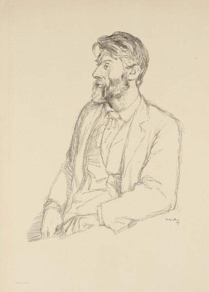 Joan Brull made this drawing, "Profile of a Man," with graphite on paper. The drawing is dominated by soft, flowing lines that define the contours of the man's face, hair, and clothing. The limited tonal range focuses our attention on the delicate textures and forms created by the pencil strokes. Brull's use of line is particularly striking. He employs a network of light, feathery strokes to build up the shapes, creating a sense of volume and depth. This technique is reminiscent of academic drawing practices, but Brull infuses it with a modernist sensibility through the sketch-like quality and lack of precise detail. The composition is simple, with the man's profile set against a neutral background, emphasizing the interplay of light and shadow on his features. The drawing prompts us to consider the role of representation and identity. By focusing on the essential lines and forms, Brull invites us to engage with the underlying structure of the image. It's a reminder that art is not just about what is depicted, but how it is depicted, and how these formal choices shape our understanding.
