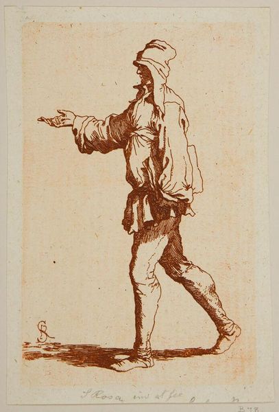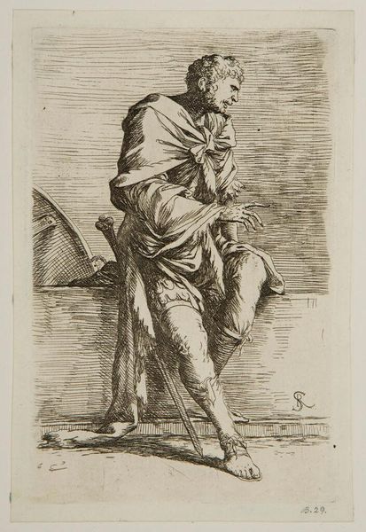Curator: This etching, "Copy after the Figurine" by Salvator Rosa, depicts a lone soldier. There is no date associated with the work. Editor: There's a kind of languid tension in the pose—he's in full armor, but there's a vulnerability present. The etched lines are so delicate. Curator: Rosa lived in a tumultuous era in Italy, rife with wars and social upheaval. The soldier embodies this, carrying the weight of conflict. Editor: Indeed, and one wonders about the politics surrounding the creation of this work. How did Rosa navigate the patronage system and the political messaging inherent in such imagery? Did it serve a particular social agenda? Curator: It could be interpreted as a reflection on the role of the military and its impact on society. Rosa perhaps captured the fatigue and moral ambiguity of warfare in the 17th century. Editor: Interesting, that the image carries such depth, in spite of its simple visual language. Curator: It speaks volumes about the artist's skill in conveying complex ideas through a seemingly simple etching. Editor: It's a stark reminder that art can be a powerful tool for social commentary.
