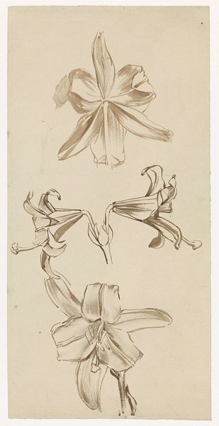 This study of lilies was created by Antoon Derkinderen, using brown ink on paper. You can see how the character of the ink, its viscosity and tone, lends itself to the delicate rendering of the flower petals. The choice of ink as a medium is significant here. Unlike pencil or charcoal, ink is difficult to erase, demanding a level of commitment from the artist. This sense of assuredness is palpable in the bold, fluid lines that define the lilies. The artist’s hand, guided by a keen eye and deep understanding of botanical form, is evident in every stroke. Derkinderen was working in a time of great social change. While this drawing may seem like a simple study of nature, it is also a testament to the enduring power of observation and skill. It invites us to consider the labor involved in creating art, and the ways in which artists like Derkinderen used traditional materials to capture the beauty of the world around them. It’s a wonderful challenge to any distinction between fine art and craft.