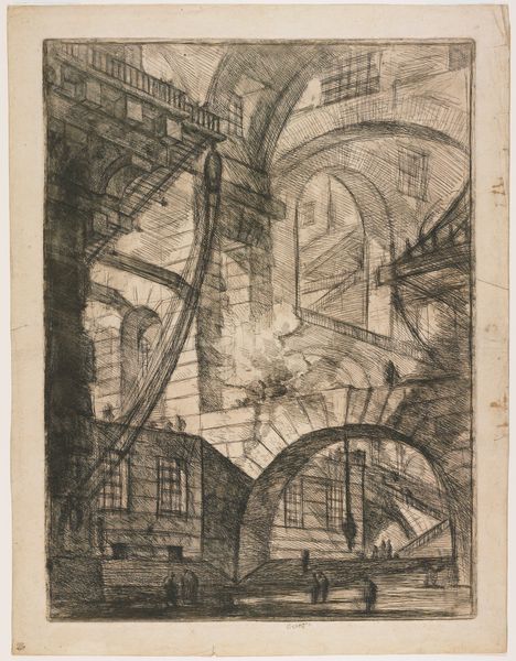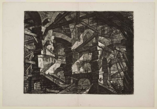 Giovanni Battista Piranesi made this etching, "The Gothic Arch," part of his "Imaginary Prisons" series, in 18th-century Italy. The print depicts an elaborate, cavernous architectural space, perhaps inspired by the ruins of ancient Rome. The dizzying perspective, with its maze of stairways and arches, evokes a sense of disorientation and confinement. Piranesi was working in a period when the institution of the prison was undergoing a transformation, with new ideas about punishment and reform emerging. His "Prisons" reflect this cultural moment. They invite us to consider the psychological effects of incarceration. The image creates meaning through visual codes, like the stark contrast between light and shadow. Further research into the history of penal systems in 18th-century Europe, along with Piranesi’s other works, can help us contextualize this print, and better understand the complex relationship between art, power, and the built environment.