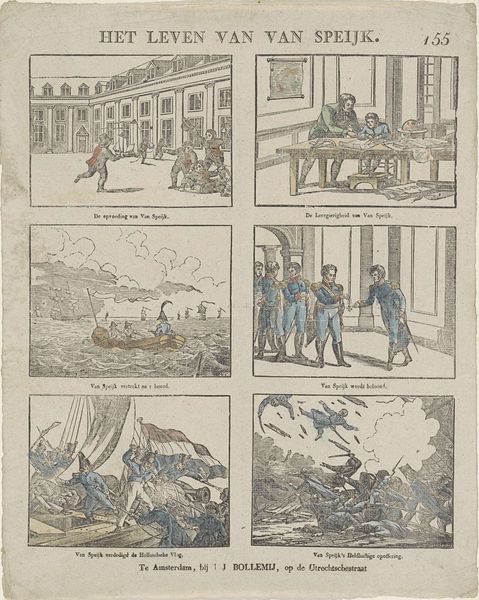 This print, "Life of Van Speijk", was made by Alexander Cranendoncq, sometime in the early 19th century. It's a lithograph, a printing technique that democratized image production. It allowed for relatively quick reproduction and widespread distribution, making art accessible beyond elite circles. The lithographic process itself is interesting here: the artist would draw on a flat stone with a greasy crayon, then treat the stone to accept ink only where the crayon was. This printmaking method allowed for the easy reproduction of images. The print's hand-colored details add another layer of significance, offering subtle details. Each copy would have been touched by an artisan, blurring the lines between mass production and individual craftsmanship. The print’s content – a celebration of a national hero – speaks volumes about the rise of nationalism and the construction of historical narratives in the 19th century. By examining its materials and making, we gain insight into the broader social and political context in which it was created. This reminds us that art is always intertwined with labor, politics, and consumption.