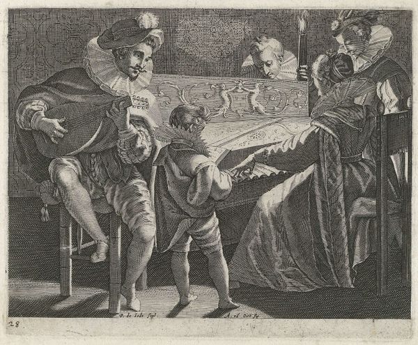 Curator: This engraving, "Musicerende selskab akkompagneret af Tiden" from around 1600 by Gillis van Breen, really speaks to the societal norms of its time, doesn't it? Editor: It’s interesting, a scene of leisure! The figures are grouped around a keyboard instrument with one playing the lute, and overall it gives me a strong sense of, well, indulgence. What jumps out at you when you look at this print? Curator: What interests me most is how it critiques this very indulgence. The figure of "Time" lurking in the background suggests a commentary on the fleeting nature of pleasure, typical of Baroque vanitas themes. How do we read the presence of Time in relation to social class? Do you see the warnings embedded in this portrayal of leisure? Editor: That makes sense. I hadn't considered the lurking figure of Time as a critique but, looking at it again, it definitely casts a shadow over the scene of musical entertainment. But I'm curious, what does situating it within a broader narrative of class tell us? Curator: Well, think about who has the privilege to engage in leisure, in musical pursuits. It's not the working class. This image can be interpreted as a subtle reminder of mortality aimed at those in positions of privilege. The scene appears to normalize a world of class differences, even as the allegorical figure reminds the elite of inevitable change. Editor: So, it's not just a scene of music, but also a reminder about societal inequalities and, you’re right, who has the luxury of ignoring time. Curator: Precisely. And remember, art is never neutral. Even seemingly straightforward depictions of daily life are imbued with ideology and power dynamics. Editor: That’s a great point. Thanks, it has really changed how I see it now. Curator: Indeed! Looking at art with a critical eye always unveils new layers of meaning.